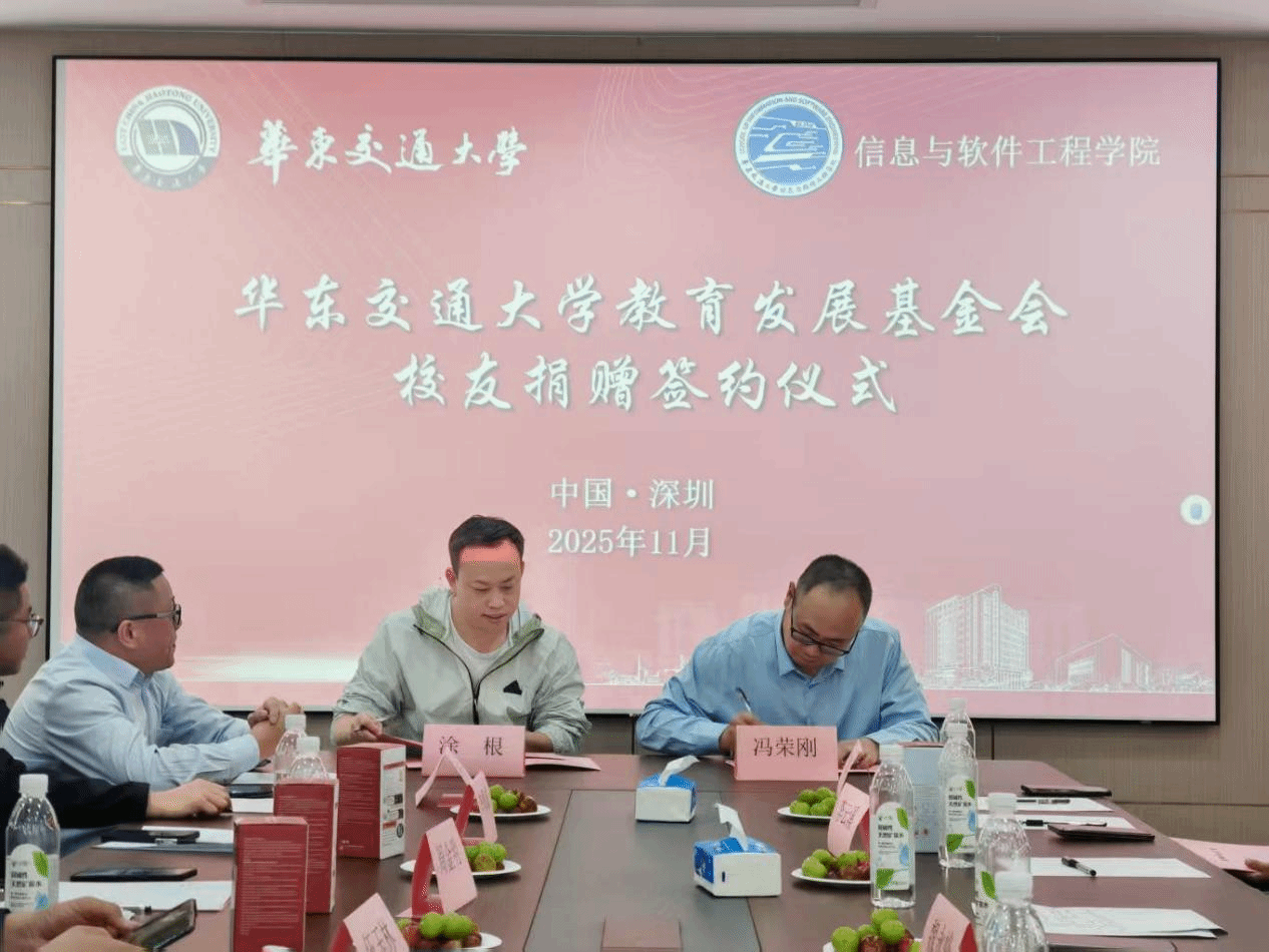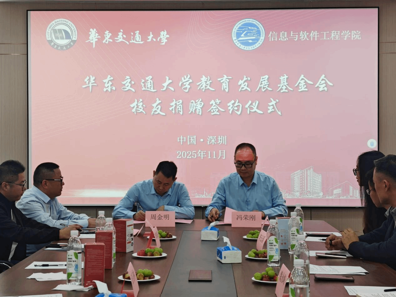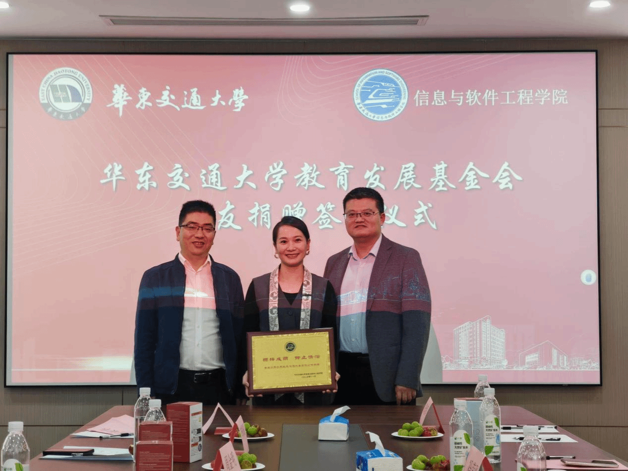 仪式上,学院1997级计算机科学与技术校友、华为技术有限公司产品总监李云溪,2001级软件工程校友、深圳博睿合创科技有限公司董事长周金明,2001级计算机科学与技术校友、江西北辰轨道交通设备有限公司总经理余姝丹,2002级计算机科学与技术校友、深圳市途铭科技有限公司总经理涂根,2004级软件工程校友、佛山市争先敢为科技有限公司董事长董颖,2006级软件工程校友、广东与凡科技有限公司总经理袁衎清,2008级软件+机械电子工程校友、深圳正翊电气有限公司总经理黄羽飞,2011级软件工程校友、深圳市开普视通科技有限公司总经理李斌代表广大校友向华东交通大学教育发展基金会进行捐赠。此次捐赠资金将专项用于学院办学环境改善、人才培养等。