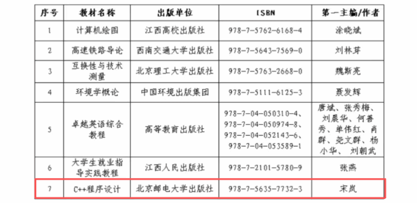 近日,江西省教育厅发布《关于公布江西省普通高等教育本科省级规划教材入选名单的通知》(赣教高字[2026]7号),雅博扑克 宋岚老师主编的《C++程序设计》成功入选第二批江西省“十四五”普通高等教育本科省级规划教材。