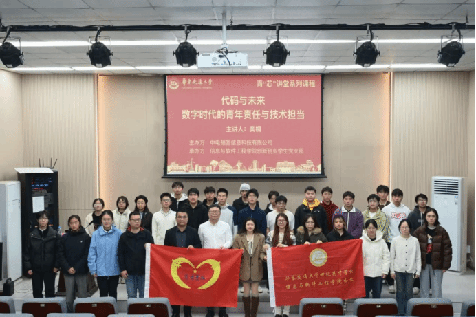 分享结束后,嘉宾与师生合影留念。通过本期讲堂,同学们对行业与技术有了更深入的了解,培养了“红色工程师”情怀,在数字时代的浪潮中明确了自身技术使命与成长方向。